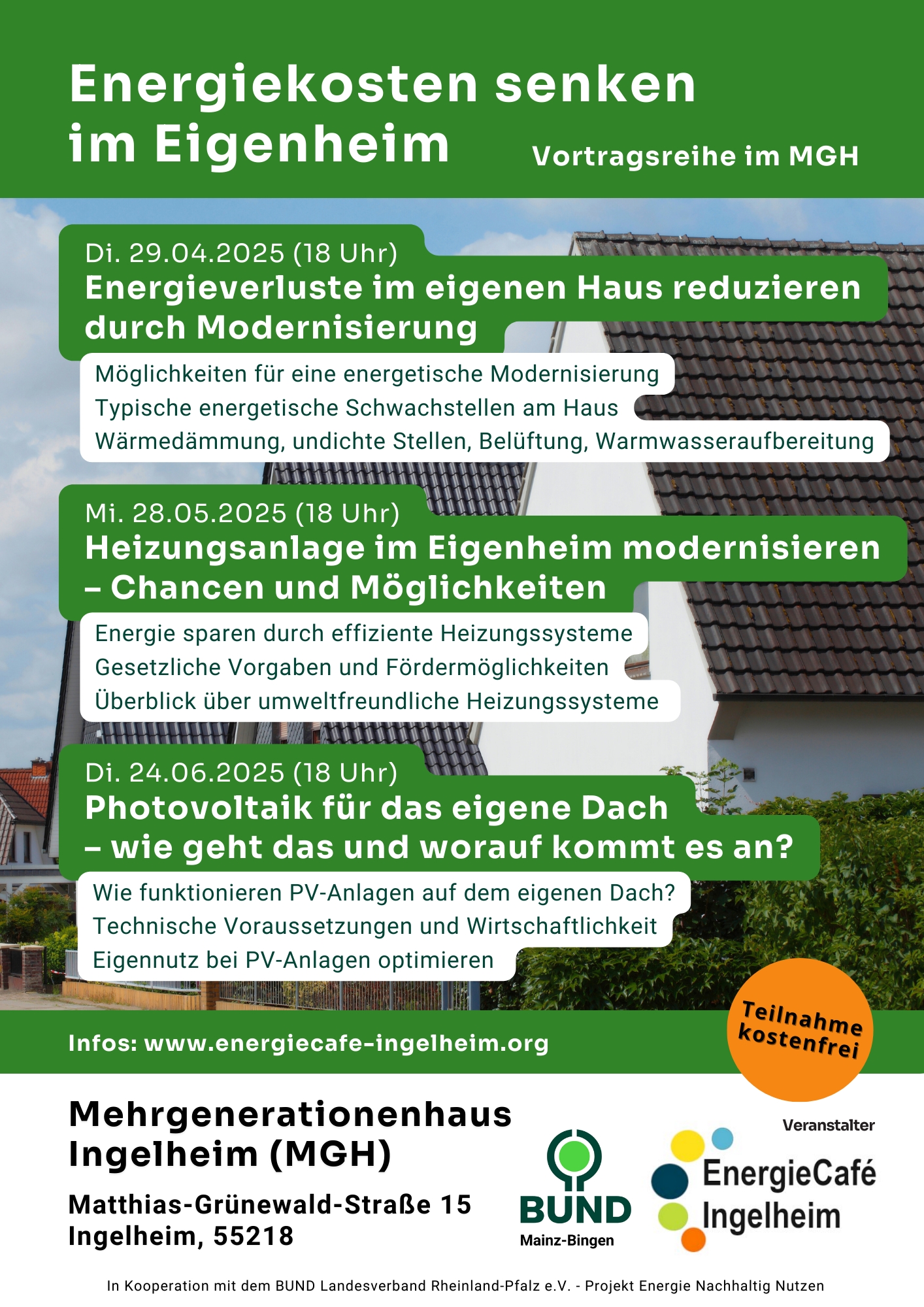 Die Veranstaltung richtet sich vor allem an Eigentümerinnen und Eigentümer von bestehenden Familienhäusern, die sich allgemein informieren möchten und noch keinen konkreten Sanierungsfahrplan für ihre Immobilie entwickelt haben. Der Vortrag ist Teil einer Veranstaltungsreihe der BUND-Kreisgruppe Mainz-Bingen. Den Flyer dazu finden Sie hier.